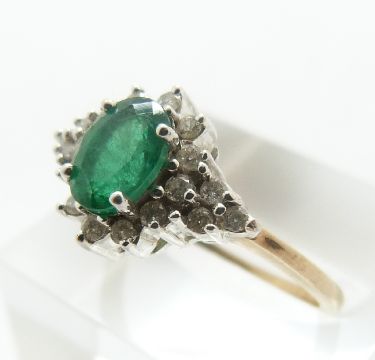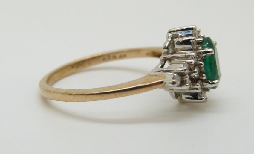 A 9ct gold ring set with an oval cut emerald of approximately 0.75ct surrounded by diamonds, size N/O, 2.93g