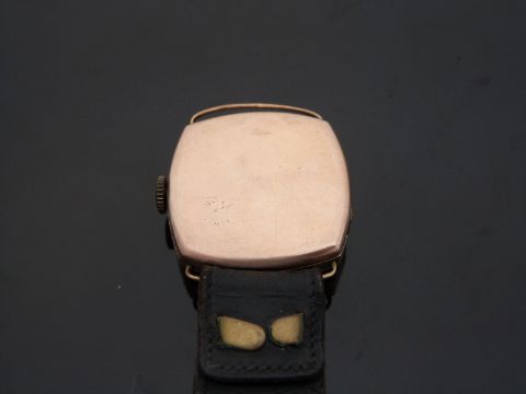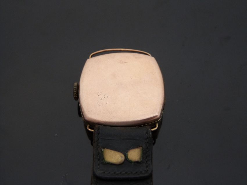 Military style 9ct gold gentleman's wristwatch with subsidiary seconds dial, pierced hands, Arabic numerals, silver face, wire lugs, cushion shaped case and Marconi Lever 15 jewel movement, case diameter 32mm, serial number 4679.