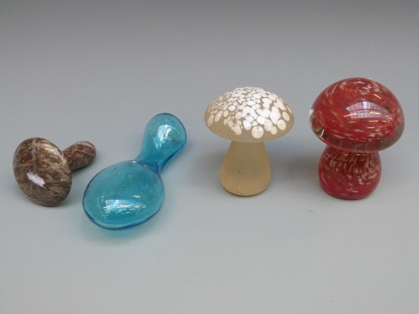 An American glass darning/sewing slipper, two glass darning mushrooms and a Serpentine stone example