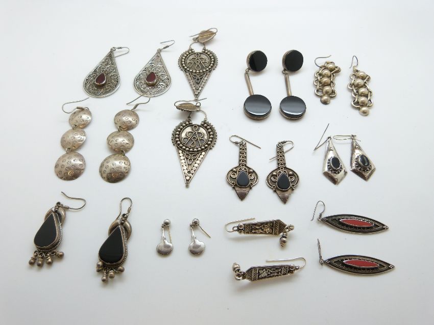 A collection of Indian silver earrings and silver earrings marked Mexico, in glass jewellery box