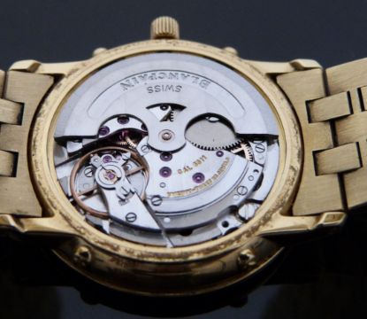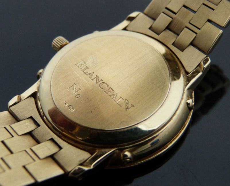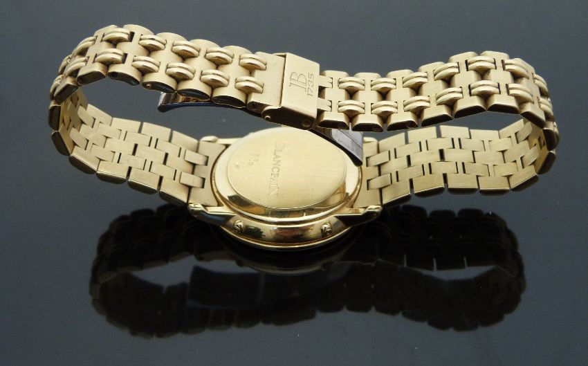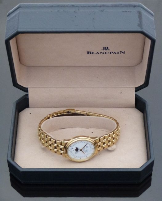 Blancpain Villeret 18ct gold triple calendar gentleman's automatic wristwatch, ref 6395, with moonphase, gold Roman numerals, black hands, white face and 23 jewel calibre 6511 movement, on 18ct gold bracelet, case diameter 33mm, engraved 315, in original box with 9ct gold adjustment tool and related paperwork and guarantee also numbered 315