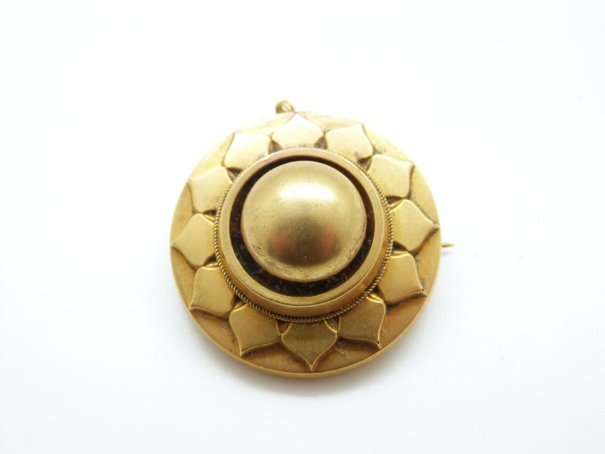 A Victorian yellow metal brooch with stylised floral design, a glass compartment verso