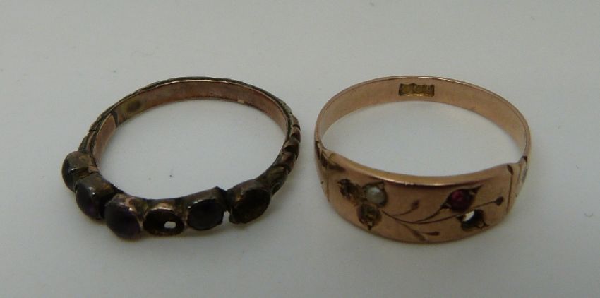 A Georgian ring set with purple cabochons and a 9ct gold ring, 3.1g