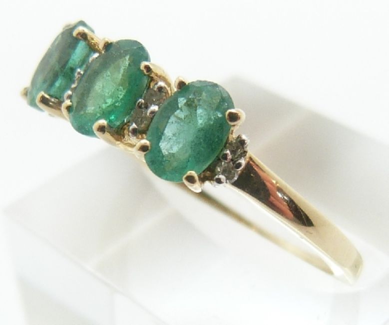 A 9ct gold ring set with three oval emeralds and diamonds, size R/S, 2.35g
