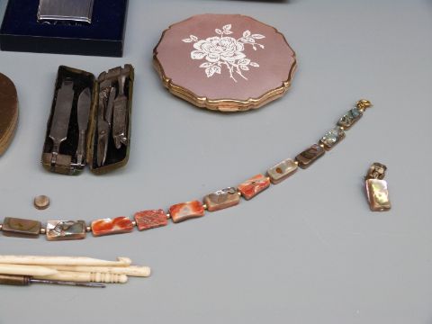 Various collectables including early faux tortoiseshell Carlo 'handbag fan', travel manicure set, compacts, lighters, Kodak timer etc