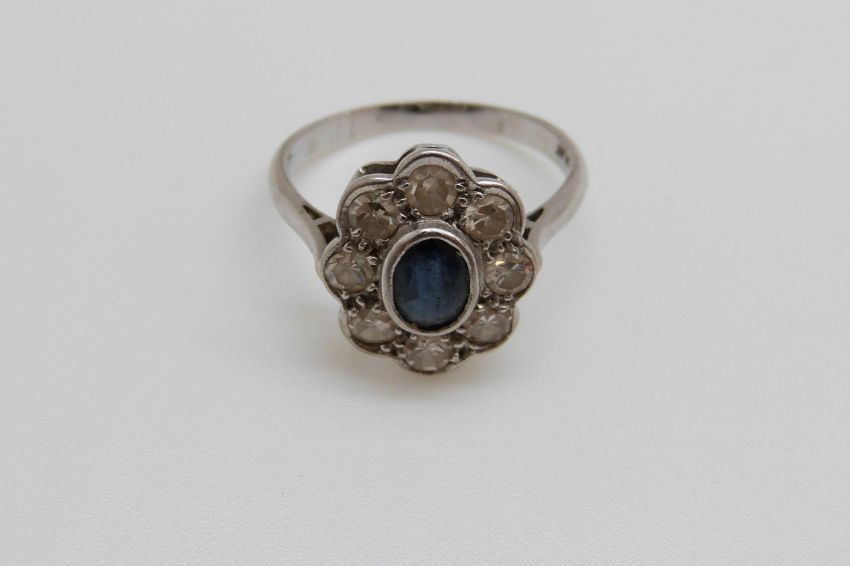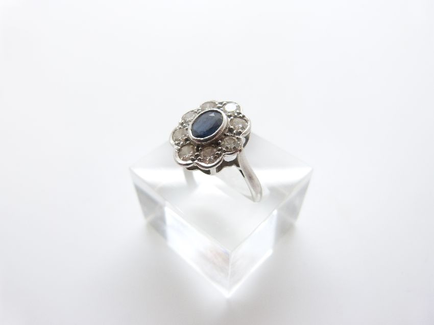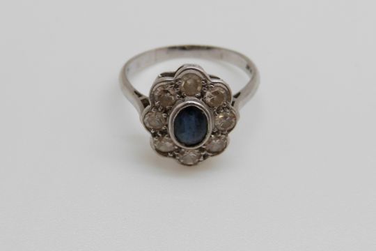 An 18ct white gold ring set with a sapphire of approximately 0.45ct surrounded by diamonds, each approx 0.08ct, size N, 3.62g