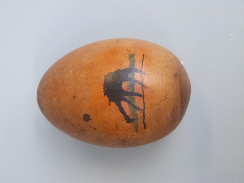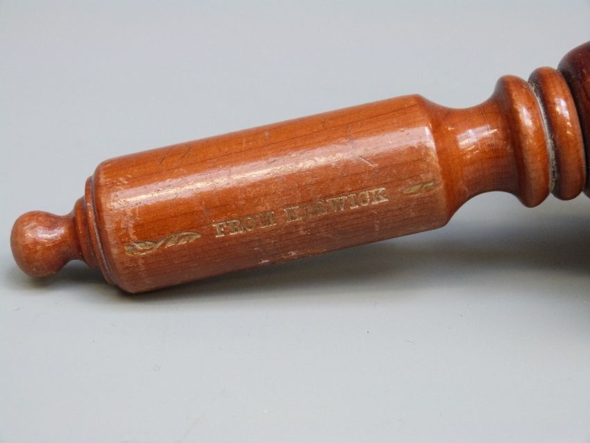 Three turned wood sewing and darning items comprising bobbin case with gilt script Jane Stratford, another 'From Keswick' and a Jerusalem holy land example