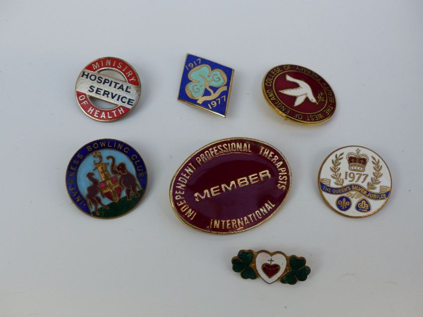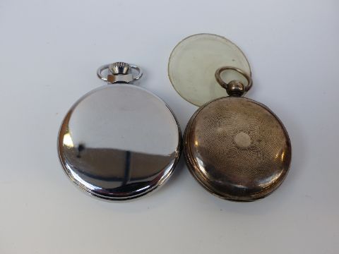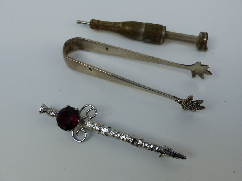 A hallmarked silver pocket watch case, Ingersoll pocket watch, coins, silver topped bottle, cap badge, hallmarked silver fish eaters, brooches, silver spoon etc