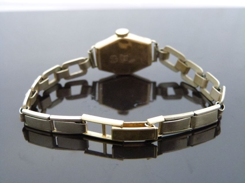An 18ct gold ladies wristwatch with blued hands, black Arabic numerals and gold face, on chain link bracelet, case diameter 12mm, 15.6g.
