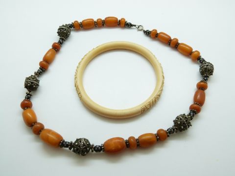 An amber necklace with white metal filigree fittings (61g) & a carved ivory bangle