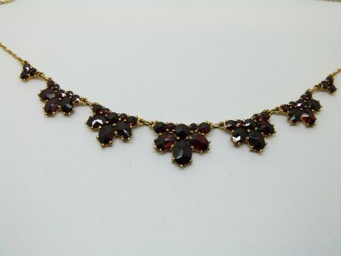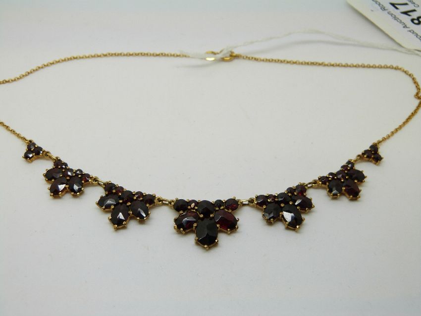 A 10ct gold necklace set with Bohemian cut garnets in seven graduated garnitures