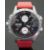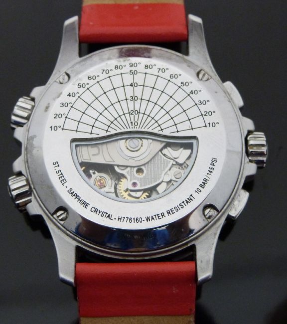 Hamilton Khaki X-Wind gentleman's automatic chronograph wristwatch ref. H77616533 with day and date aperture, luminous hands, silver Arabic numerals, double crown rotated, in flight cross wind calculator, silver and black subsidiary dials, black face, clear case back, stainless steel case and 25 jewel movement, on red leather strap, case diameter 44mm, in original box with instruction booklets and warranty card.