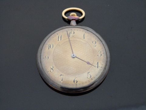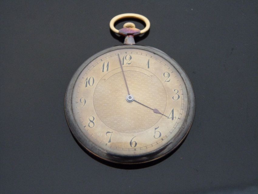 A yellow metal cased slim Art Deco style continental pocket watch with keyless wind movement and Arabic numerals, cased marked with crown and 0,750, weight 38.0g