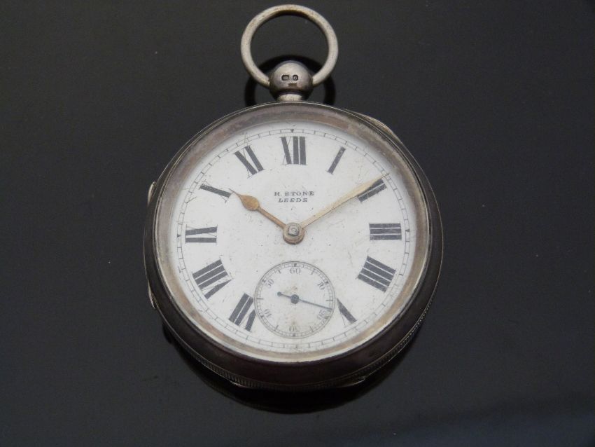 Two hallmarked silver English pocket watches W Rodwell of Leicester and H Stone of Leeds both with inset subsidiary seconds dials, Roman numerals, gold hands, white enamel faces, signed movements and engine turned cases, case diameters 50mm.