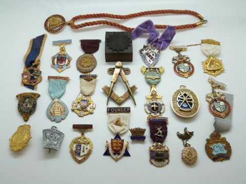 A large quantity of Masonic jewels from various lodges, includes enamel examples, lodges represented include RMIG, Kings Court Chapter 2689, Garden City and Cumberland and Westmorland; a braille example, Wiltshire Guard Lodge, 1959 Durham Province, Masonic brass door knocker, Grand Royal Arch Chapter or Ireland, Hants and Isle of Wight assistant etc