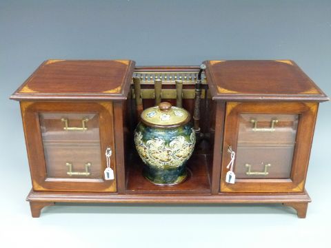 An Edwardian inlaid mahogany twin pedestal smoker's cabinet with brass rail, Doulton Lambeth lidded tobacco jar, pipes etc. The cabinet having four drawers behind twin glazed doors with spring loaded locks, both keys present, width 51.5cm