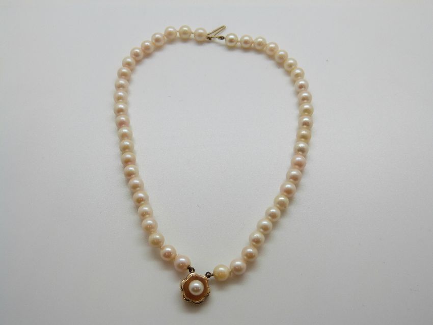 A two strand pearl bracelet with 9ct gold clasp in the form of a flower set with a further pearl