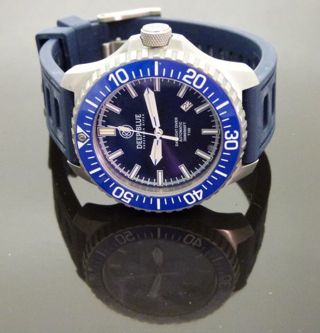 Deep Blue Daynight Diver T100 gentleman's diver's wristwatch ref. 2410, with luminous hands and baton markers, date aperture, blue face and rotating blue bezel, stainless steel case and 24 jewel calibre NH35A movement, on blue rubber strap, case diameter 46mm