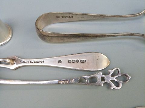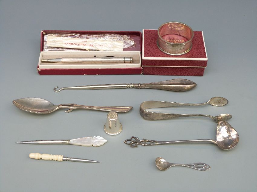 A hallmarked silver spoon, silver sugar tongs, silver ladle, silver napkin ring and boxed Yard-O-Led hallmarked silver pencil etc, weight of silver 68g