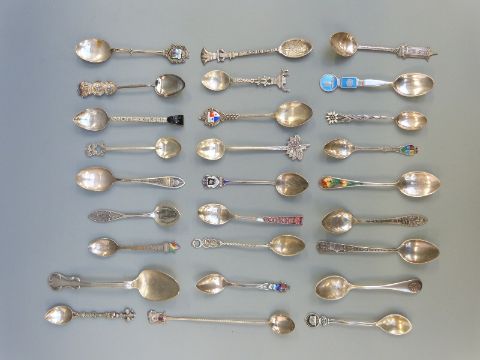 A quantity of white metal collector's spoons including examples marked sterling, Russian example etc, 282g