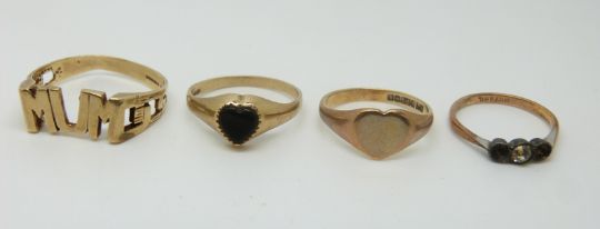A 9ct gold and silver ring, a 9ct gold ring reading MUM and two heart shaped 9ct gold signet rings (9.5g)