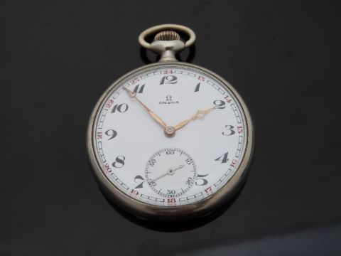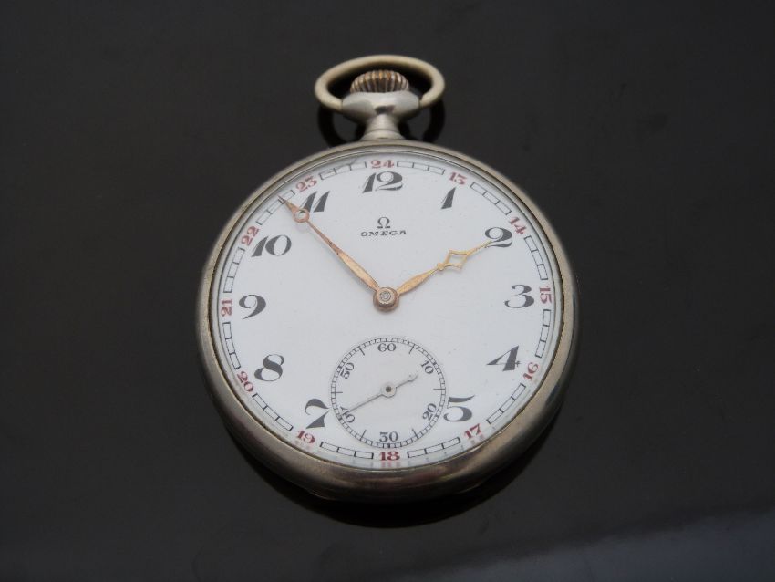 Omega nickel plated keyless winding open faced pocket watch with black Arabic numerals, red 24 hour numerals, gold hands, inset subsidiary seconds dial and white enamel face, case diameter 48mm.