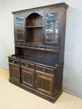 A stained pine dresser with glazed cupboards and four drawers to top, W151 x D44 x H203cm