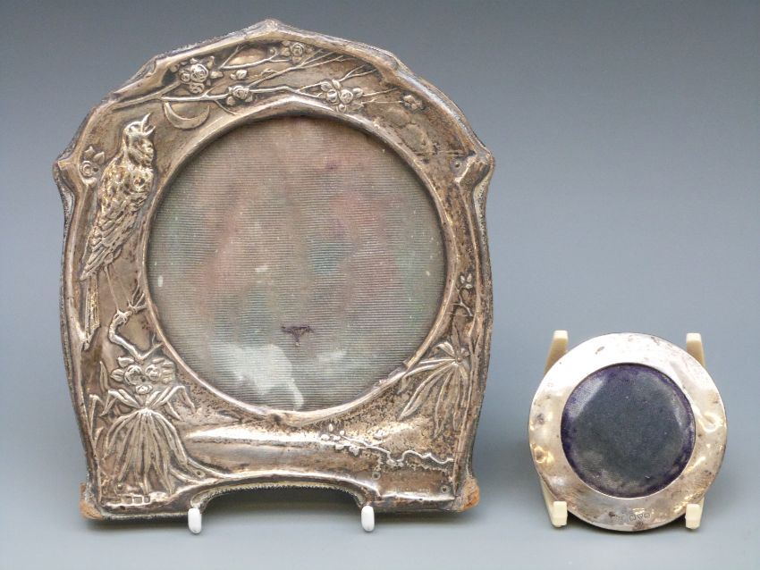 An Edwardian VII embossed hallmarked silver picture frame with a nightingale and crescent moon, floral and foliate decoration, Birmingham 1905, height 16cm, together with a hallmarked silver mounted pin cushion