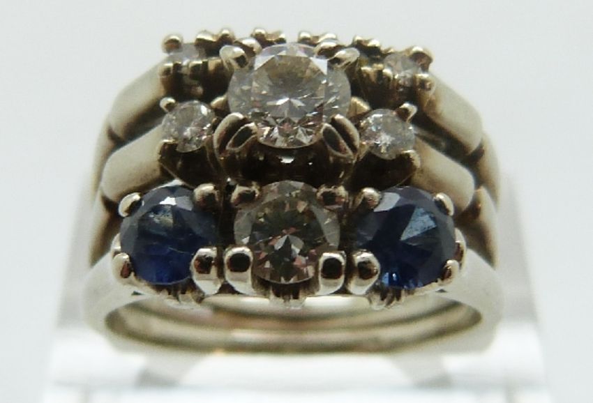 An 18ct white gold three band ring set with a round brilliant cut diamond of approximately 0.3ct, another diamond of approximately 0.2ct, two sapphires and further smaller diamonds, size P, 8.32g