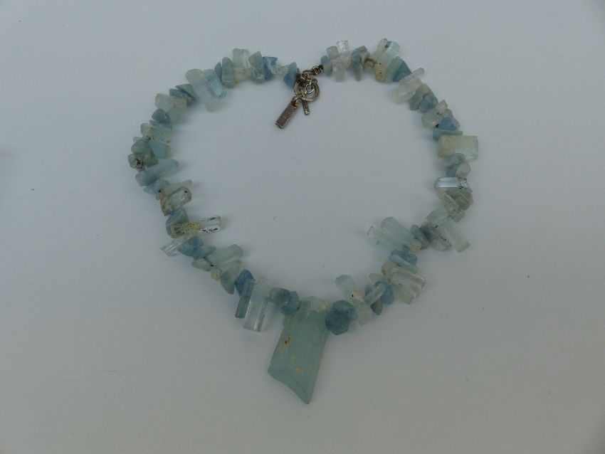 An aquamarine necklace made up of irregular pieces and natural rough sections