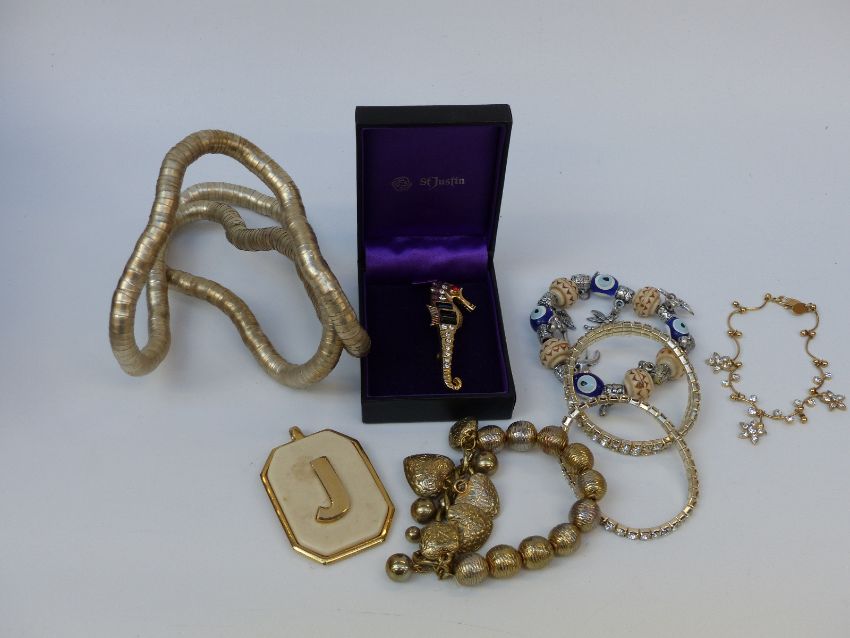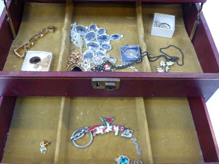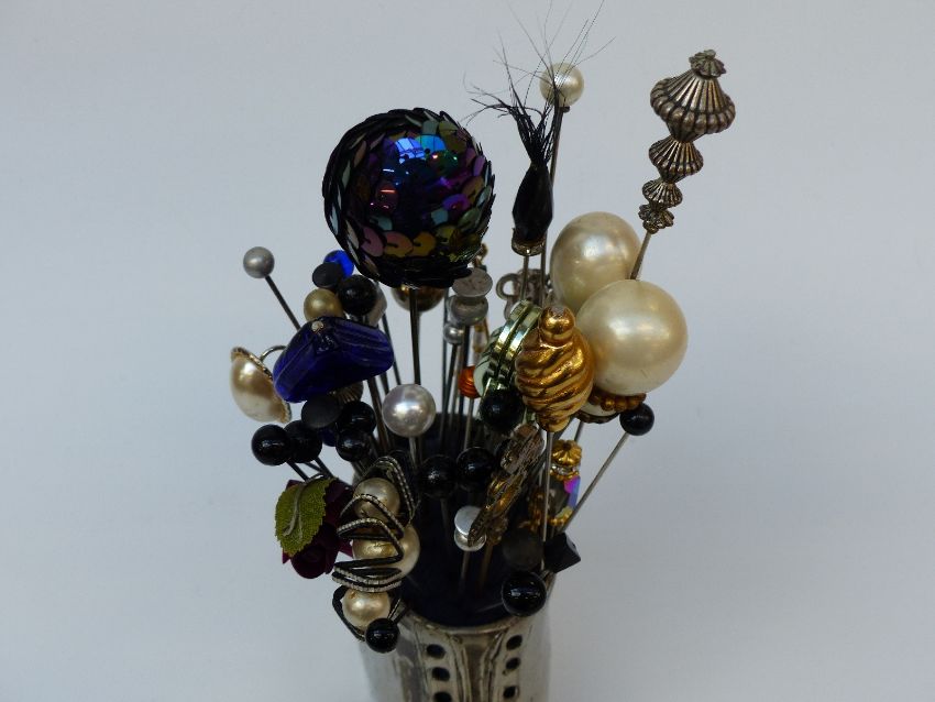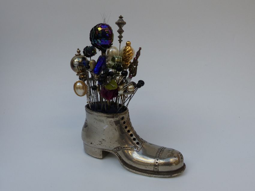 A collection of hat pins in a shoe pin cushion and a collection of costume jewellery in leather style box