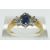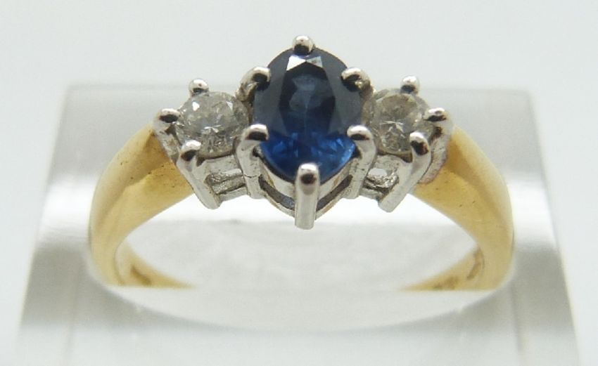 An 18ct gold ring set with an oval cut sapphire of approximately 0.5ct and two round cut diamonds totalling approximately 0.2ct, size O, 3.87g