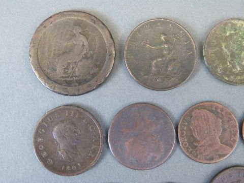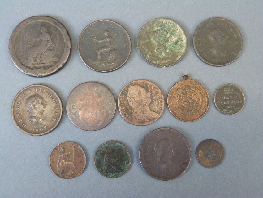 A small collection of Georgian coinage including Hibernia, various grades poor to very fine together with a few Victorian examples including an 1844 half farthing and a small unidentified hammered coin, possibly medieval jeton