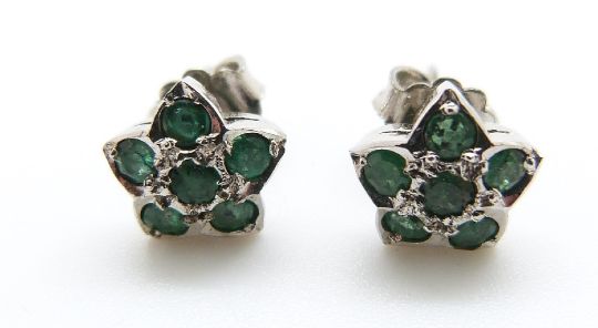 A pair of white metal earrings set with emeralds