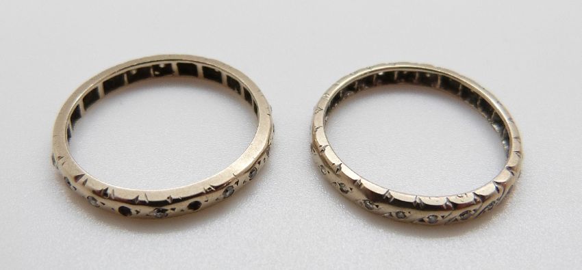 Two white gold eternity rings set with diamonds, size Q and O, 4.32g