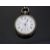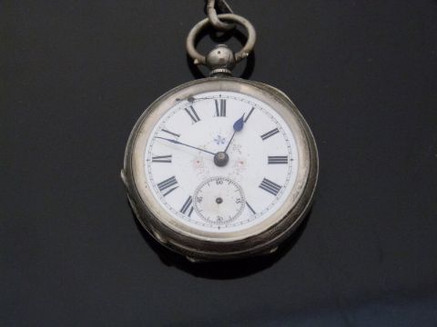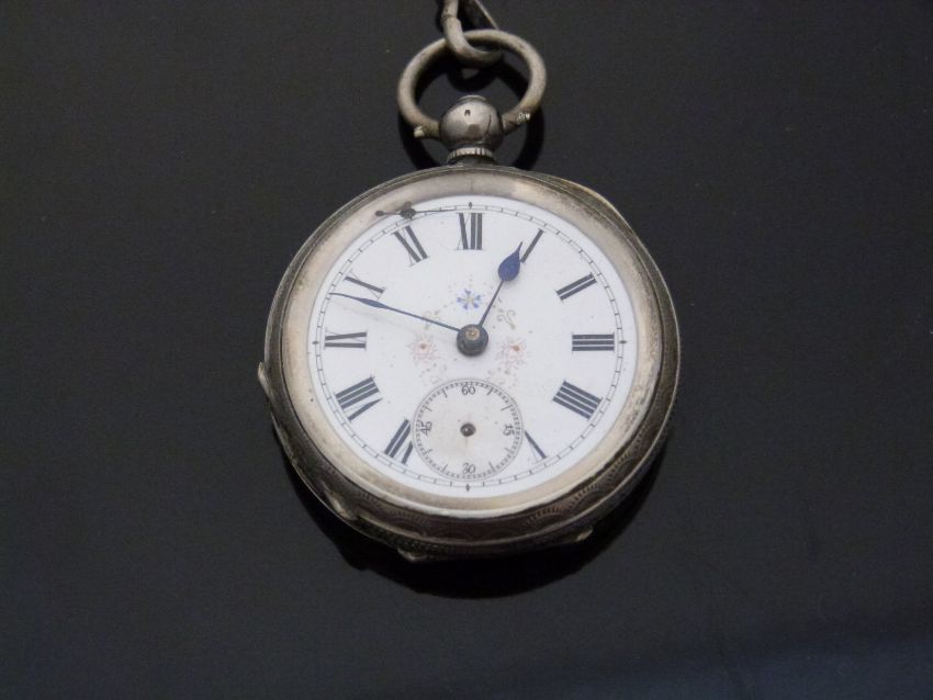 A white metal cased ladies fob watch with floral decoration to the white enamel dial, the case marked warranted 800 silver, watch chain with attached silver coins and three watch keys