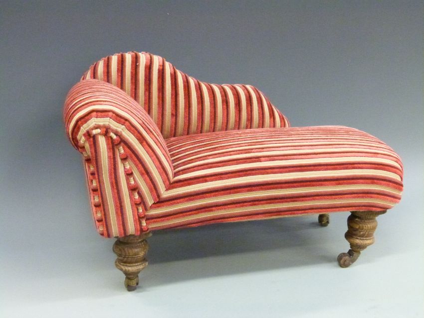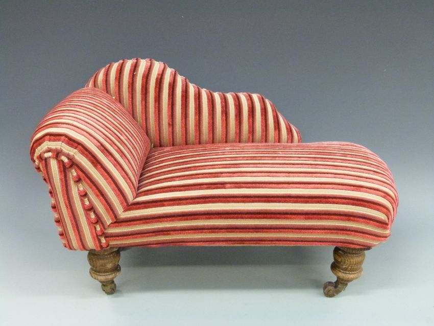 A 19th / 20thC apprentice piece or doll's chaise longue raised on turned oak legs and ceramic castors, length 46cm