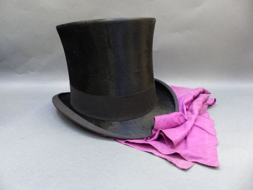 A silk top hat in fitted leather case, the hat with label for Scott and Co, Piccadilly, London, the leather case Richard Clamp, Liverpool, together with a vintage Gladstone bag