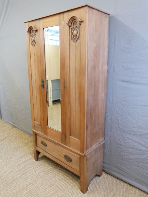 A satinwood Art Nouveau wardrobe with bevelled mirror door and single drawer below, W90 x D37 x H183cm