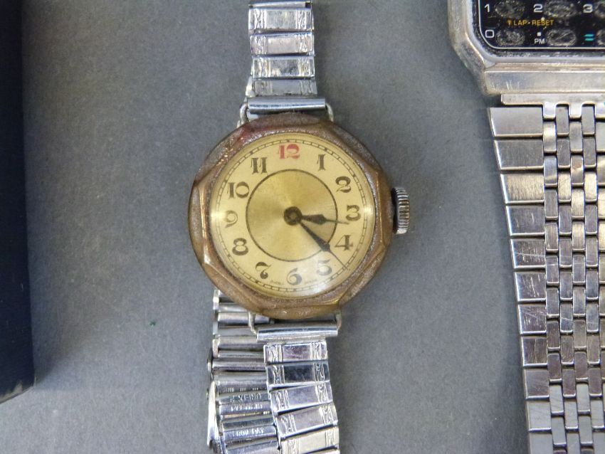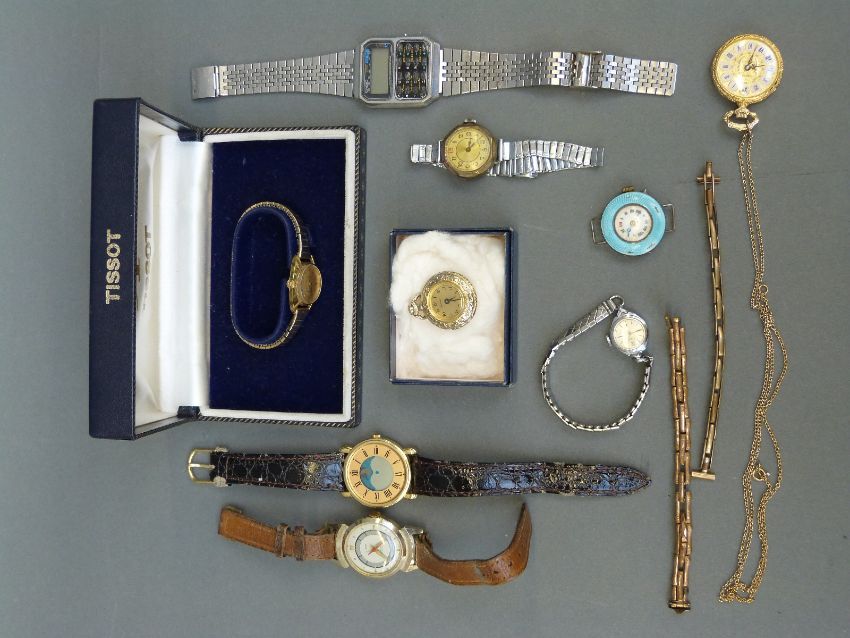 Nine watches to include an early to mid 20thC hallmarked silver and guilloche enamel ladies wristwatch, Timex, Casio, Tissot and Ingersoll