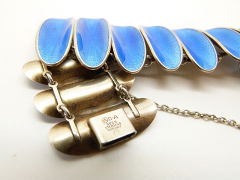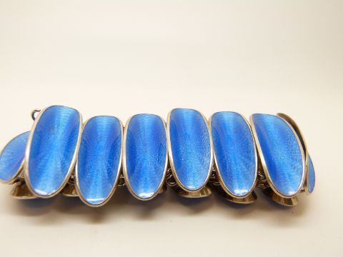 A silver bracelet set with blue guilloché enamel in oval panels by David Andersen, Norway