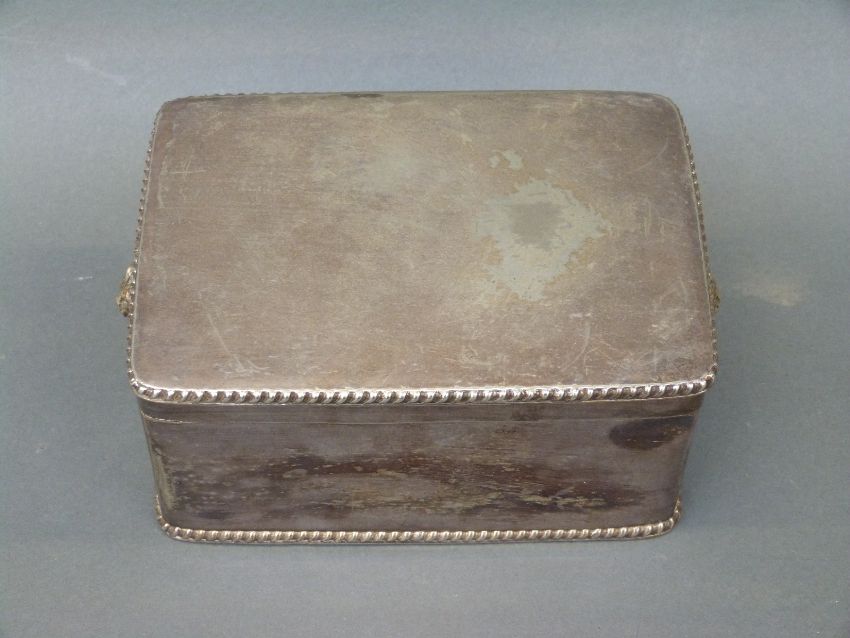Goldsmiths and Silversmiths hinged lidded biscuit tin with looped lion mask handles, toast rack, cruet, carving set etc