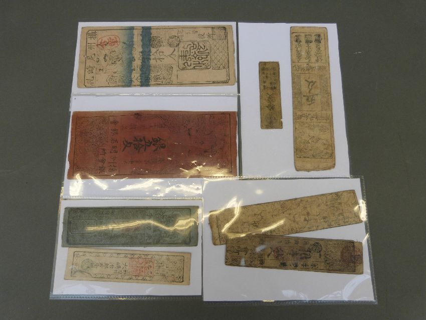 Eight 19thC Japan Hanatsu Feudal banknotes