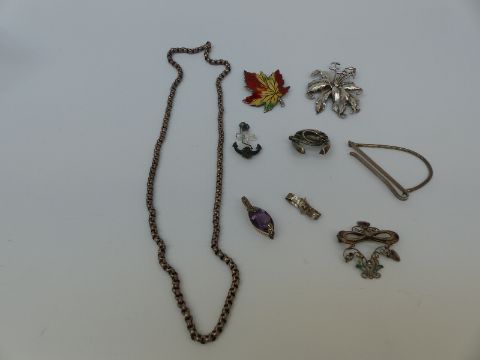 A Victorian silver brooch in the form of a horseshoe and fox, silver necklace, Art Nouveau brooch, silver pendant, silver tie clip etc