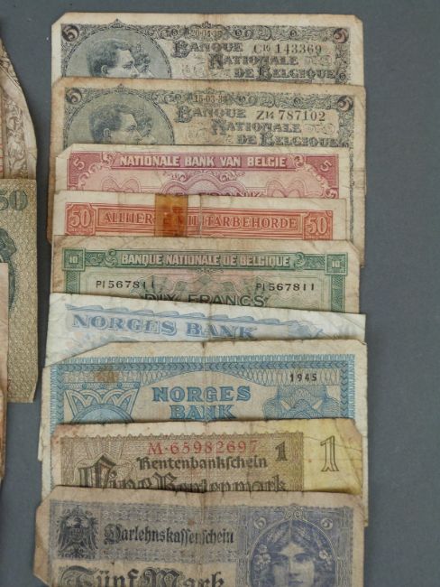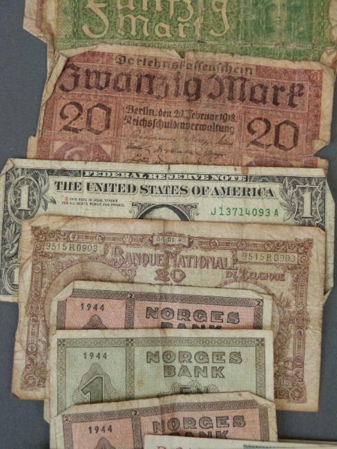 A collection of early 20thC German banknotes including a pair of crisp consecutive ten Reichsbanknotes together with Belgian, Norwegian and US dollars