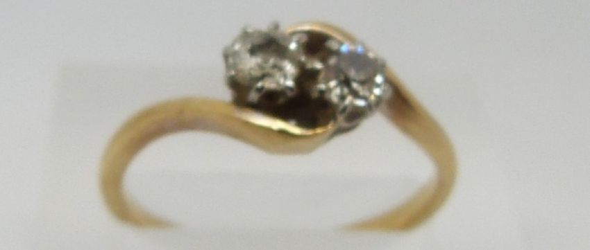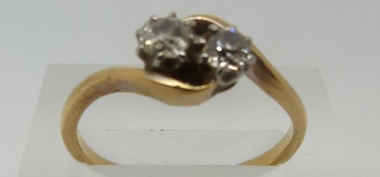 An 18ct gold ring set with two diamonds in a twist setting, 3g (size O)