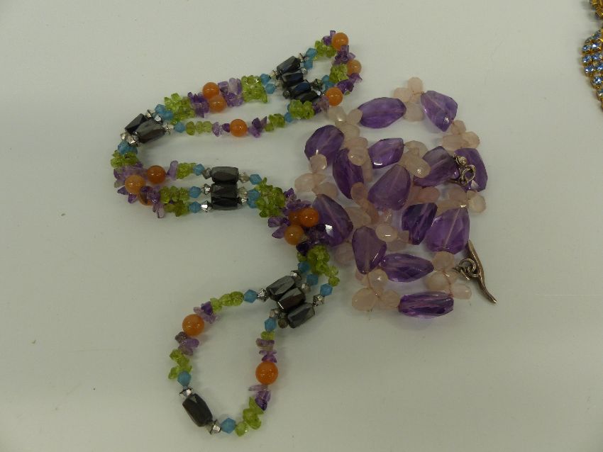 A quantity of costume jewellery including beaded amethyst necklace, sunstone necklace, shell bracelet, Tibetan earrings etc