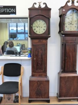 W Bishop, Trowbridge, 19thC 8-day long cased clock in flame mahogany case with cross-banded inlaid decoration, the movement striking on a bell. The circular painted Roman dial with secondary date and seconds dials and filigree brass hands. the hood with reeded columns, brass capitol, with swan neck pediments and surmounted by an eagle on an orb. 220cm tall