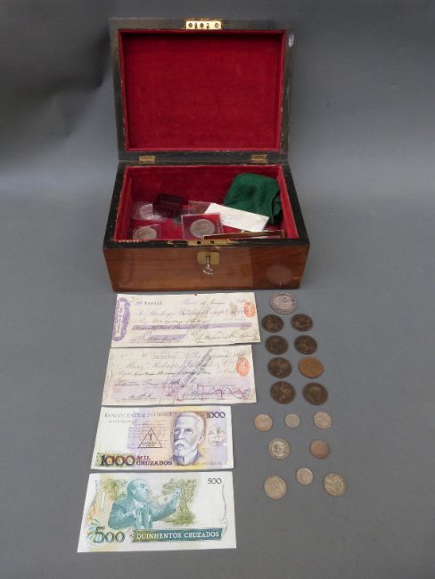 A wooden chest / caddy containing some crown sized coins including silver Britannia, 1936 Edward VIII re-strike, Maria Theresia, sovereign scales, 19thC cheques etc
