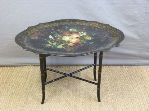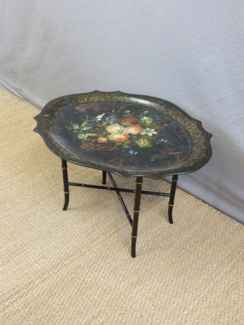 A 19thC papier maché table in the Betteridge style on aesthetic style faux bamboo base, W83 x D68 x H54cm